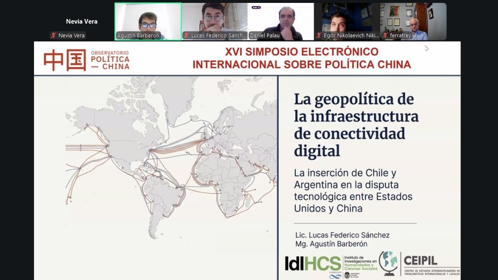 En este marco, el Mg. Agustín Barberón, integrante del CEIPIL, participó junto al Lic. Lucas Federico Sánchez (IdIHCS-UNLP) de la mesa de “Innovación, tecnología e infraestructura china”. Allí presentaron la ponencia titulada “La geopolítica de la infraestructura de conectividad digital: la inserción de Argentina y Chile en la disputa tecnológica entre Estados Unidos y China”.